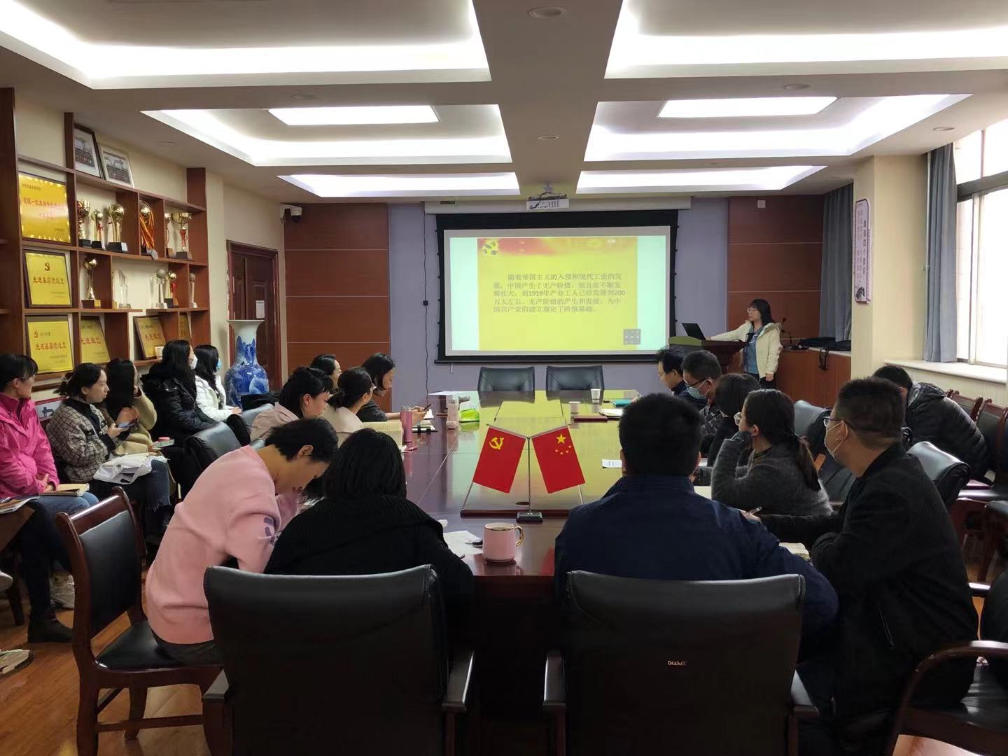 首先,教工党支部书记李子夏为大家讲授了党课《中国共产党的创立》。她为大家介绍了“中国共产党”名称的由来,并从南陈北李相约建党、俄共远东局派人来华考察、各地相继成立共产党早期组织、党的“一大”标志着中国共产党正式成立四个方面为大家详细介绍了中国共产党的创立历程。