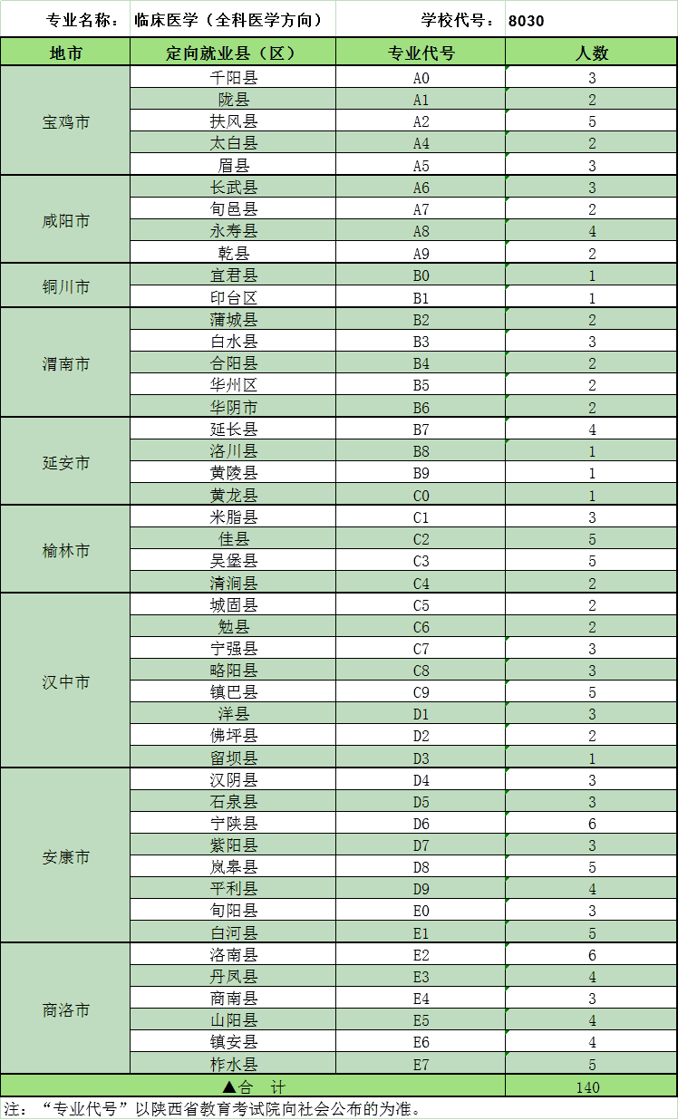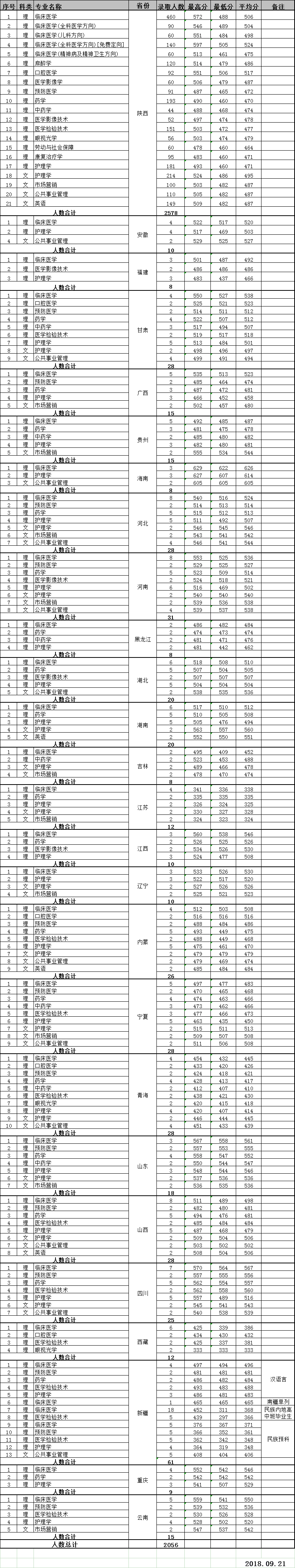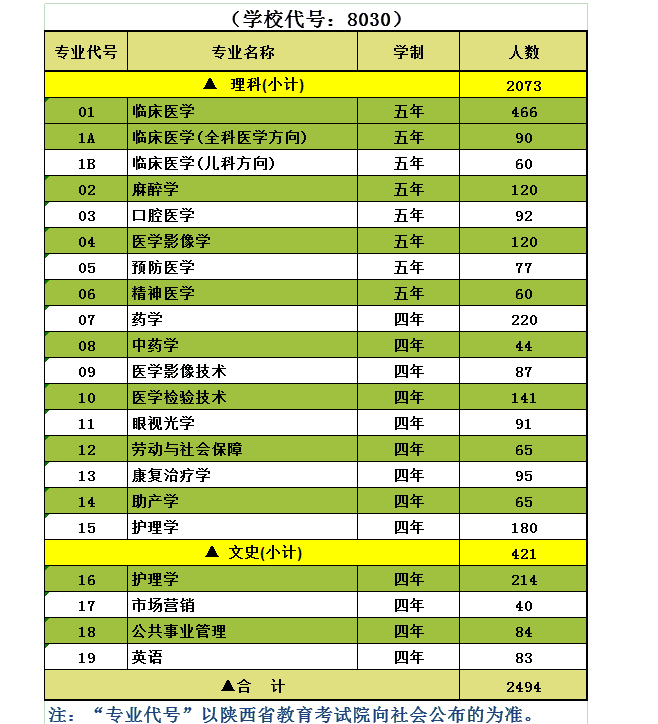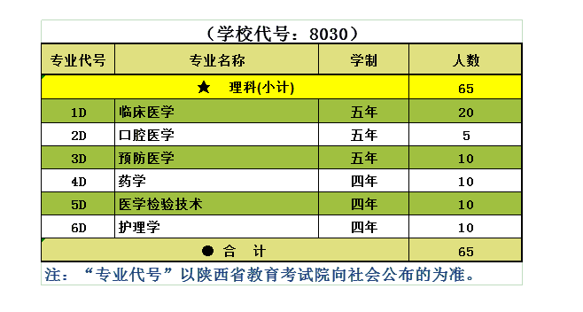 2019年我校在陕本科提前批次国家免费医学定向生计划一览表