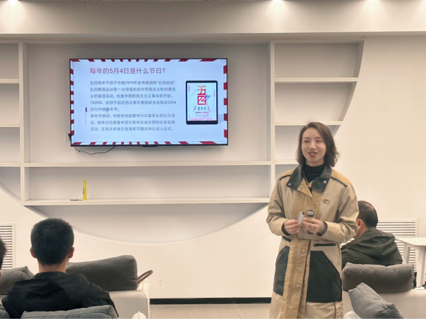 罗玉洁从五四运动的历史过程、五四运动的历史意义以及如何弘扬五四精神三个方面进行了讲述,引导学生牢记五四精神:爱国、进步、民主、科学,团结奋斗。呼吁我们要脚踏实地、志存高远,弘扬革命先驱的五四精神,坚定远大理想,努力奋斗前行,履行好我们这一代人的责任和使命。