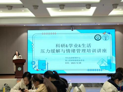 为贯彻落实我校团员和青年主题教育,增强同学们面对科研学业压力的管理能力和应对技巧,降低负面情绪影响,更好地平衡学习,科研和生活。2024年12月26日晚,致玉科研创新创业协会于图书馆五楼会议室开展主题为“科研学业及生活压力缓解与情绪管理”培训讲座。此次培训讲座由石梦婧老师主讲,pp电子官方网站辅导员曲建利老师及协会34名学生参加学习。