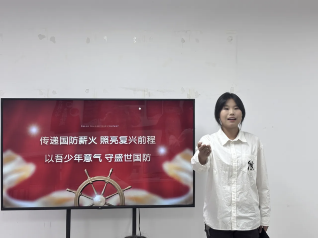 刘伊珊以“以青春之名,铸国防之盾”为主题,通过讲述自己对国防的理解,表达了对国防事业的热爱。她提到,国防不仅是军人的职责,也是每一个公民的责任。她通过分享自己参与国防教育活动的经历,强调了国防教育的重要性,呼吁同学们积极参与国防教育,增强国防意识。