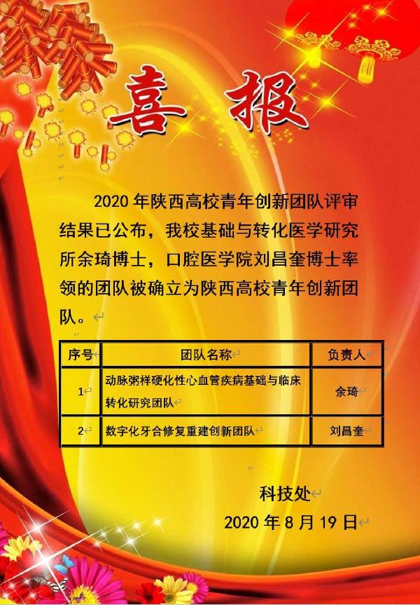 近日,陕西省教育厅公布了2020年度陕西高校青年创新团队,pp电子官方网站刘昌奎教授领衔的“数字化牙合修复重建创新团队”入选立项,这是pp电子官方网站首次获批入选陕西高校青年创新团队,是pp电子在创新团队建设中取得的重大成绩。