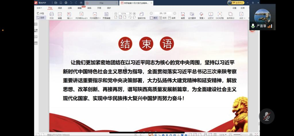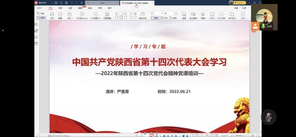 2022年6月21日晚,pp电子官方网站教工党支部邀请严喜章院长为全体教工党员讲授党课,主题为中国共产党陕西省第十四次党代会精神传达,会议形式为腾讯线上会议。