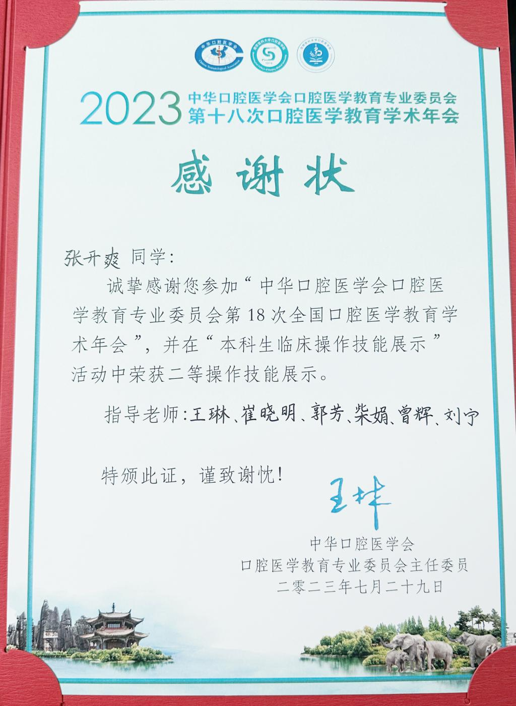 本科生临床操作技能展示大赛环节共有来自全国80多个院校的学生参加。经过初赛、复赛和决赛三轮比试,我校2019级本科张开爽同学凭借过硬的临床技能、沉着的心理素质,以总分第9名的好成绩荣获了本科生口腔临床技能展示(临床操作组)二等奖,充分体现了学校的教学质量和学生良好的精神风貌。