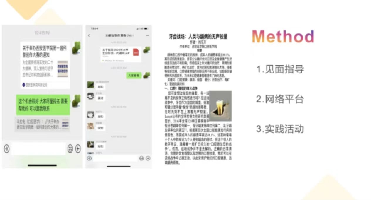 2023年10月,学院启动2023级本科新生导师制工作,9名老师结对帮扶106名本科生。该工作开展以来,依托“一站式”学生社区,引导学生在思想政治教育引领、阅读文献汇报、科普大赛、职业规划大赛等方面成效显著,使口腔医学生在校期间就涉足学科前沿,跟踪发展趋势,激发专业学习兴趣,对优秀口腔人才培养起到了积极的推进作用。(文/图 徐世聪 审核/周晓华)