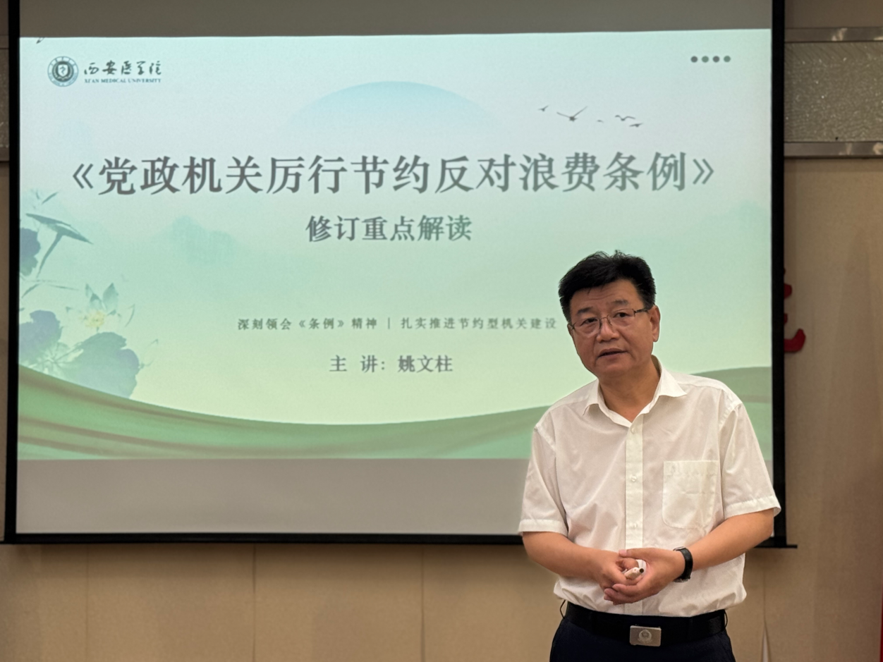 姚文柱以深入贯彻中央八项规定精神学习教育的核心与实质为切入点,引出了本次党课的主题-2025年5月2日由中共中央、国务院颁布的《党政机关厉行节约反对浪费条例》(以下简称《条例》)的修订重点。姚文柱从《条例》修订背景与意义、《条例》新增重点内容解读、抓好《条例》学习宣贯三方面,结合具体事例和案例,深入浅出地为学院教师解读《条例》的相关内容。他表示,艰苦奋斗、勤俭节约、反对浪费是我们党的光荣传统和优良作风,全体教职工应该从自身出发,提高政治站位,结合学院实际严格落实学校过紧日子的要求。同时对学院深入贯彻中央八项规定精神学习教育、推进节约型机关建设、持续深化纠治“四风”具有重要意义。