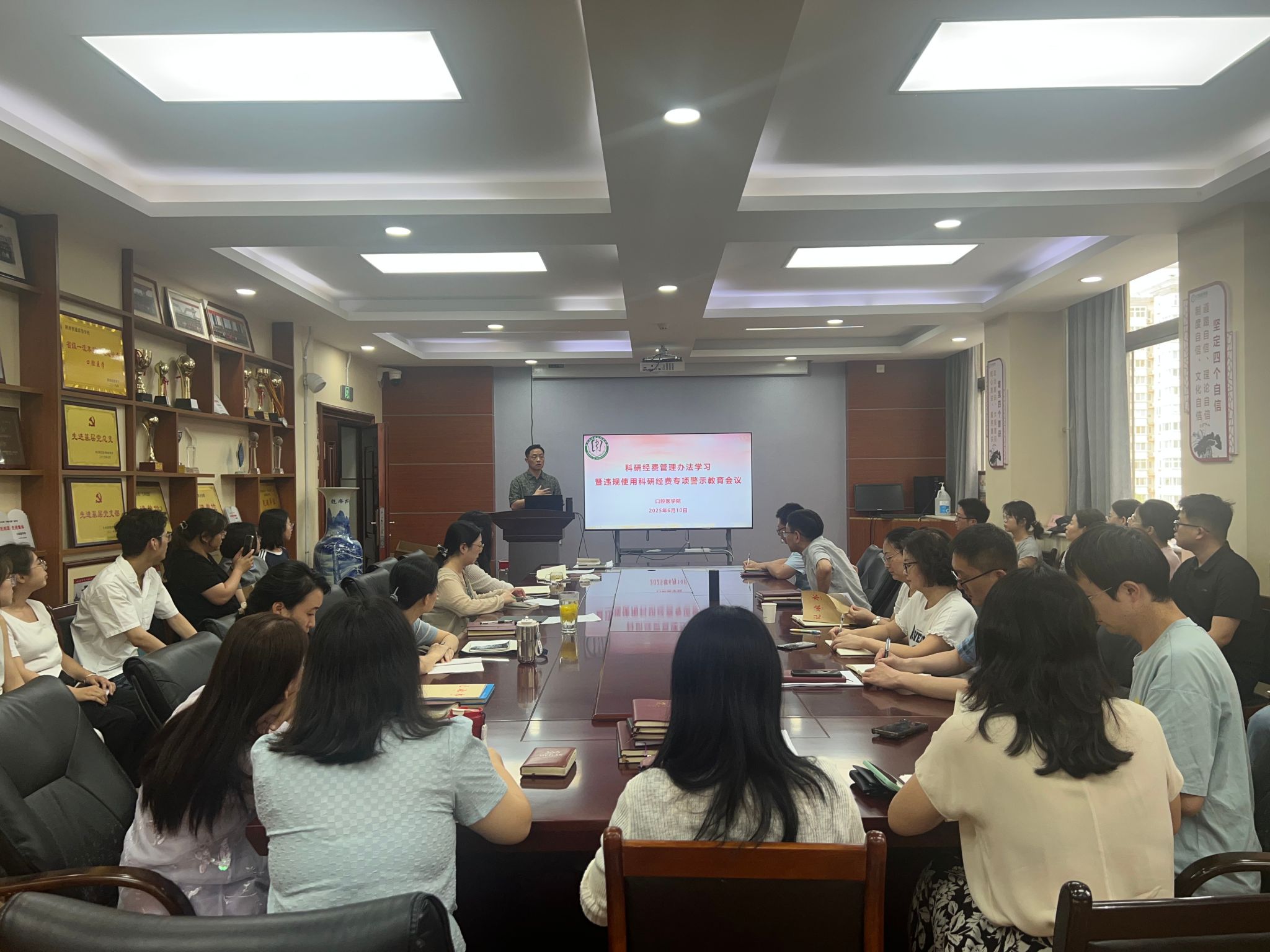 学习活动围绕三大核心内容展开:深入研读国家、陕西省及学校科研经费管理办法;剖析虚报冒领、违规转拨经费等典型案例,结合口腔医学专业特点补充针对性案例;学习科研诚信建设相关文件,从制度与案例双维度强化警示教育。各团队通过集中领学、案例研讨等形式,推动科研人员明确经费使用红线与操作规范。